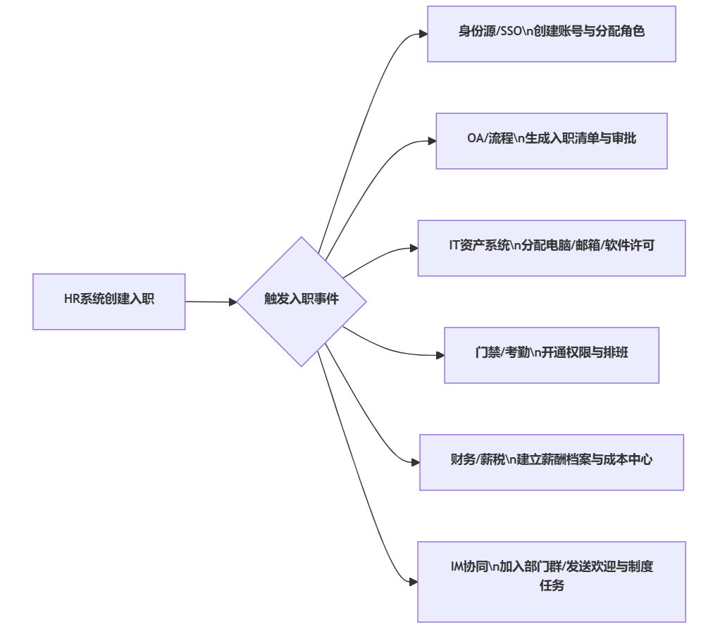 创建入职后,是否能在分钟级完成账号开通、门禁权限、IT资产工单、财务档案;出现失败是否能自动告警并可重试;所有动作是否有审计记录。提醒一句:如果流程只能靠人工在多个系统反复录入,那上线后的效率改善通常会低于预期。