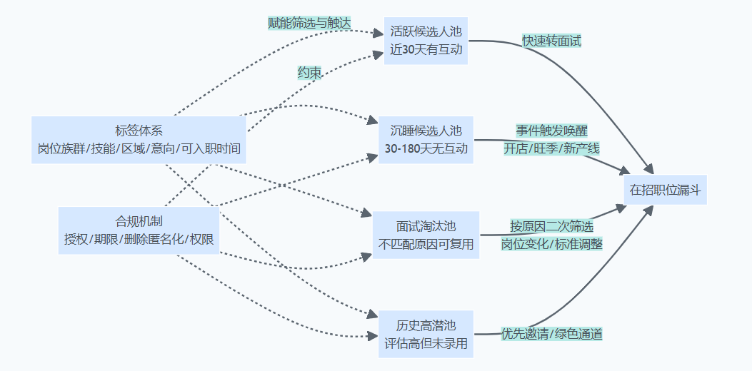 - 人才库先建标签再做触达:先把分层规则与合规机制搭好,再做自动唤醒;否则触达越多,负反馈越大。