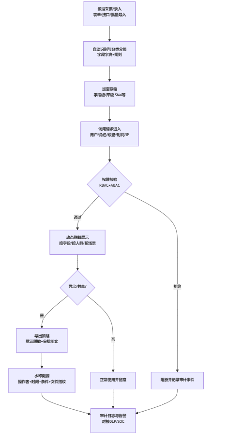 为了把这一模块的链条说清楚,下面用流程图呈现敏感数据全流程处理逻辑,便于对照系统能力清单做检查。