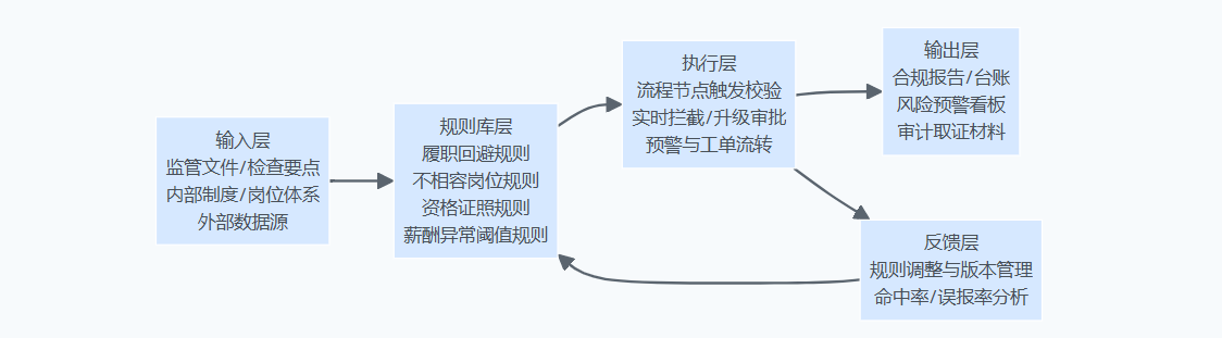 三、嵌入式合规规则引擎:把制度翻译成“可执行、可更新、可审计”的规则