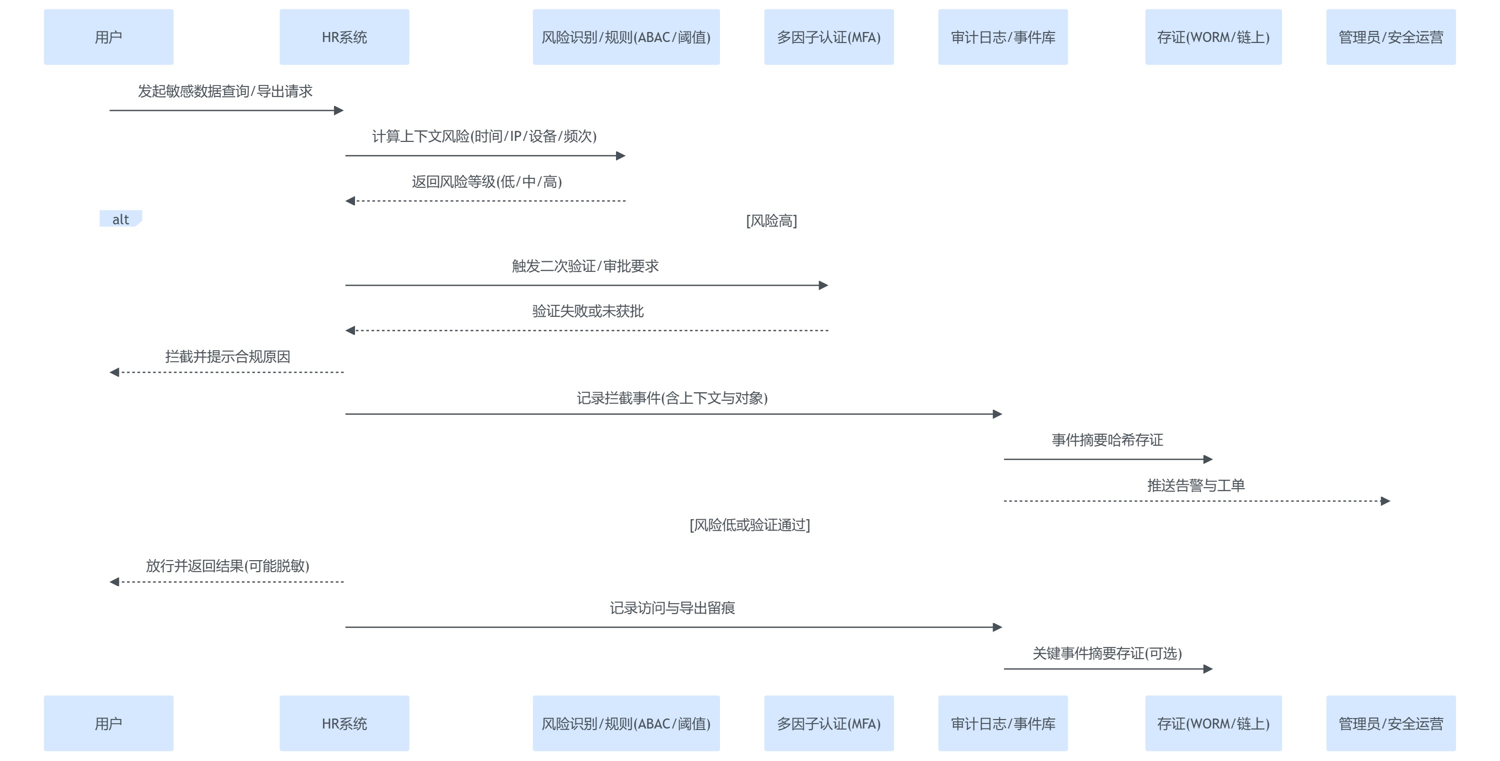 - 高风险动作识别:批量导出、查询高管敏感字段、连续下载附件、接口拉取全量数据等。