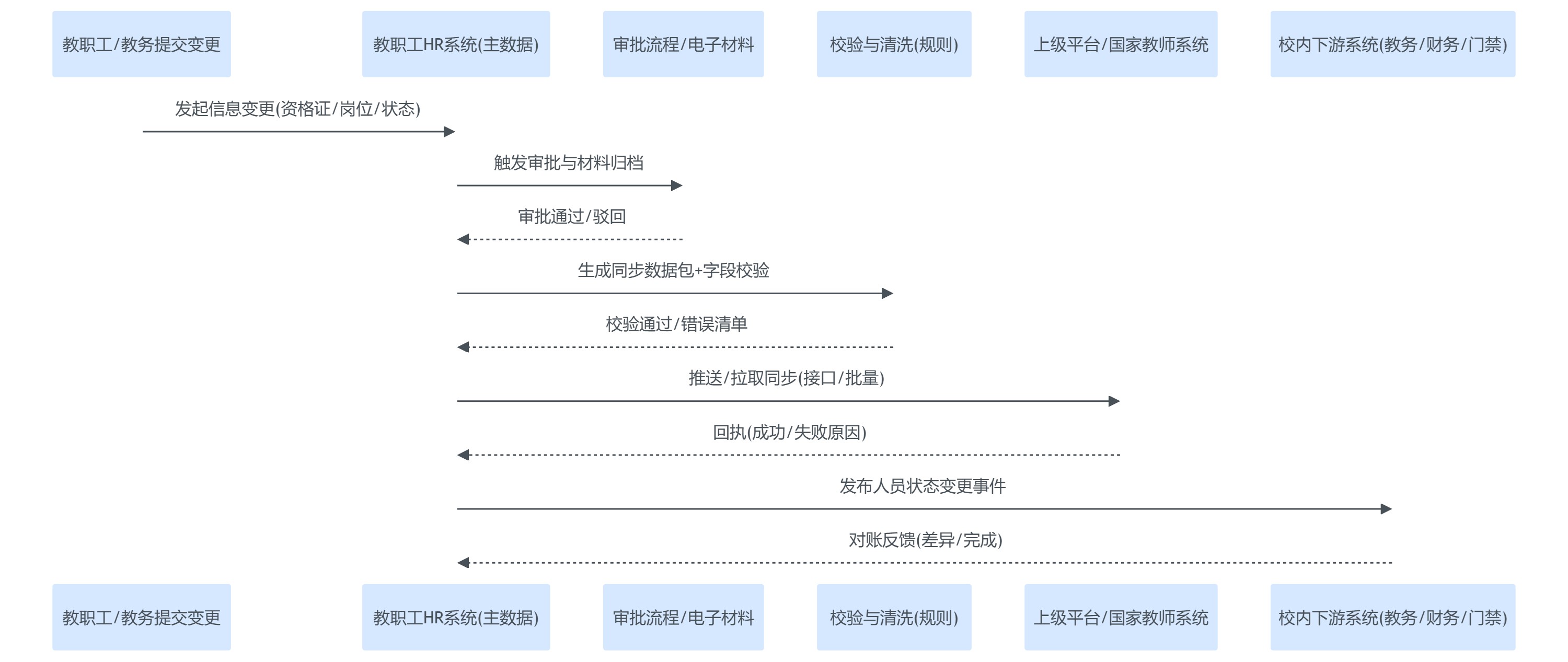在技术实现上,一种更稳妥的模式是:以教职工HR系统作为校内主数据源,教务、科研、门禁考勤等作为业务系统;当人员状态变化(入职、调岗、离职)时,通过接口或消息机制触发下游更新,避免“各系统各自维护一份人员表”。