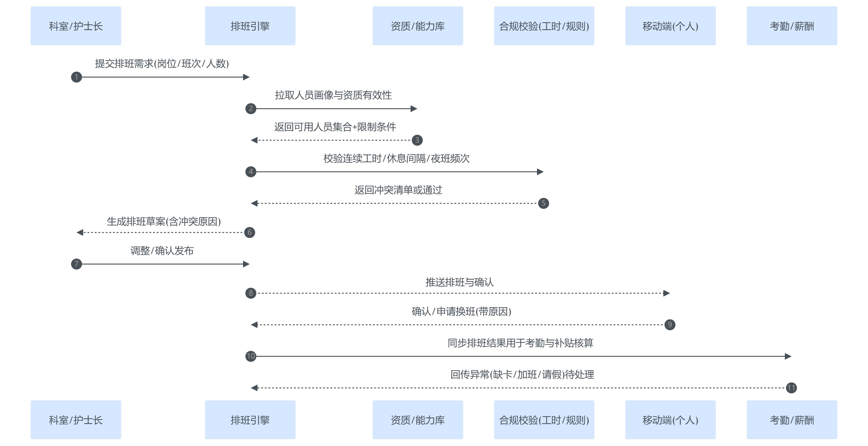为了把流程讲清楚,排班模块建议用“业务时序”来验收:从需求发起到发布、再到确认与考勤闭环,每一步都能看到责任人、校验点与日志。