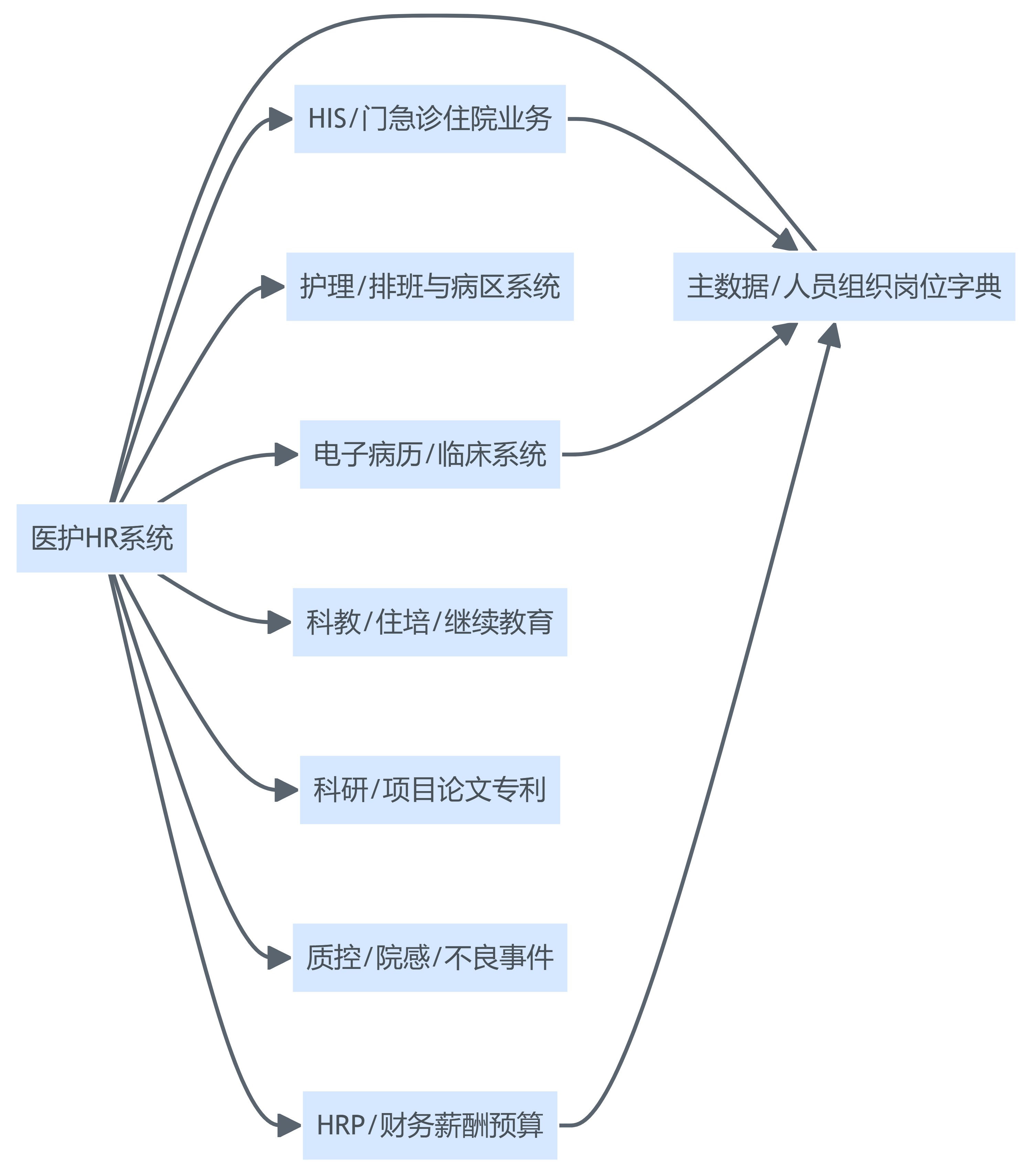 - 围绕业务闭环集成,而不是围绕接口数量:例如排班结果进入考勤与补贴核算,资质变更反向影响授权与排班,职称材料从源系统聚合到电子档案。