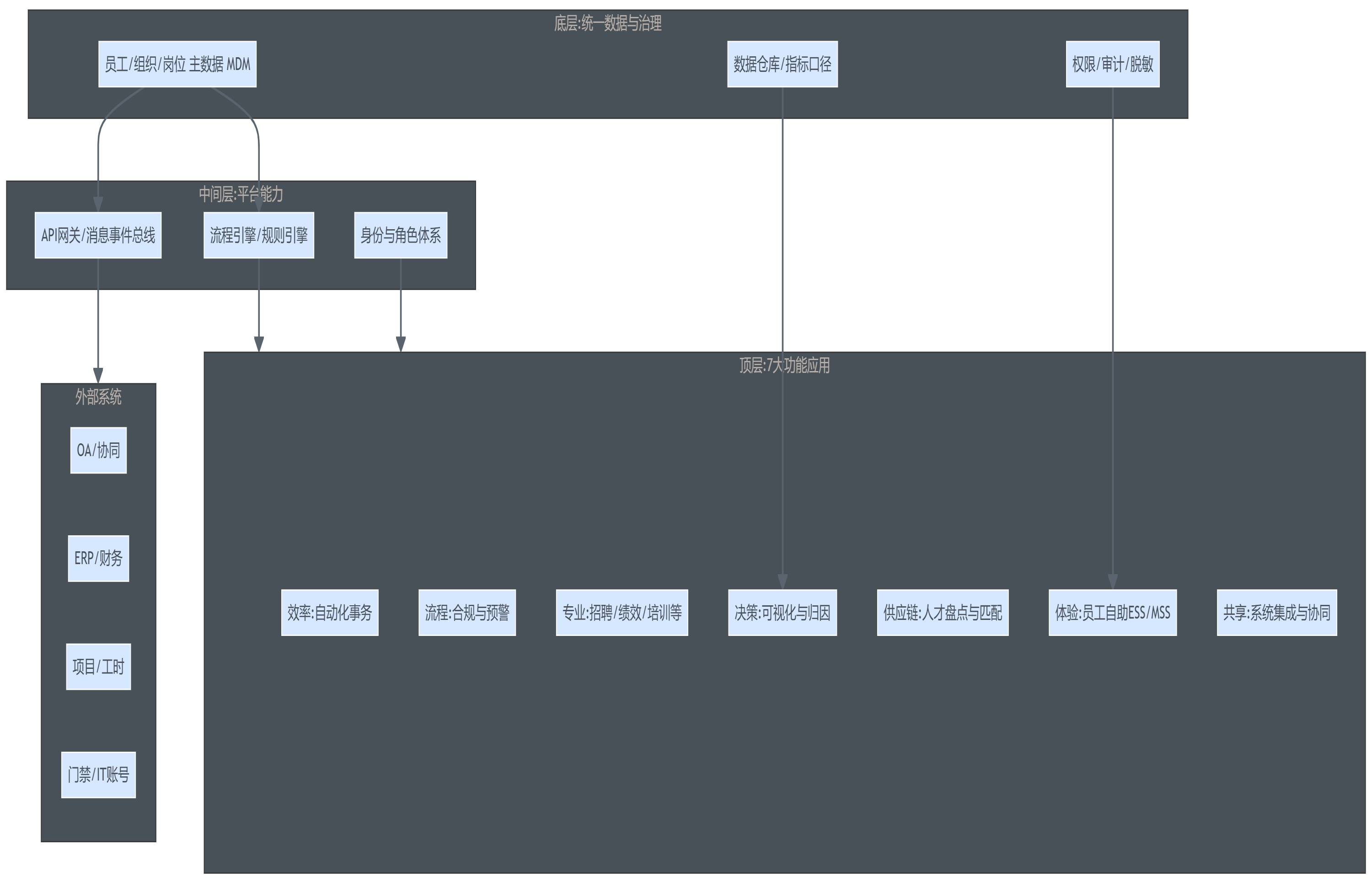- 事件驱动:关键事件触发下游动作(入职触发账号开通、调岗触发成本中心变更)