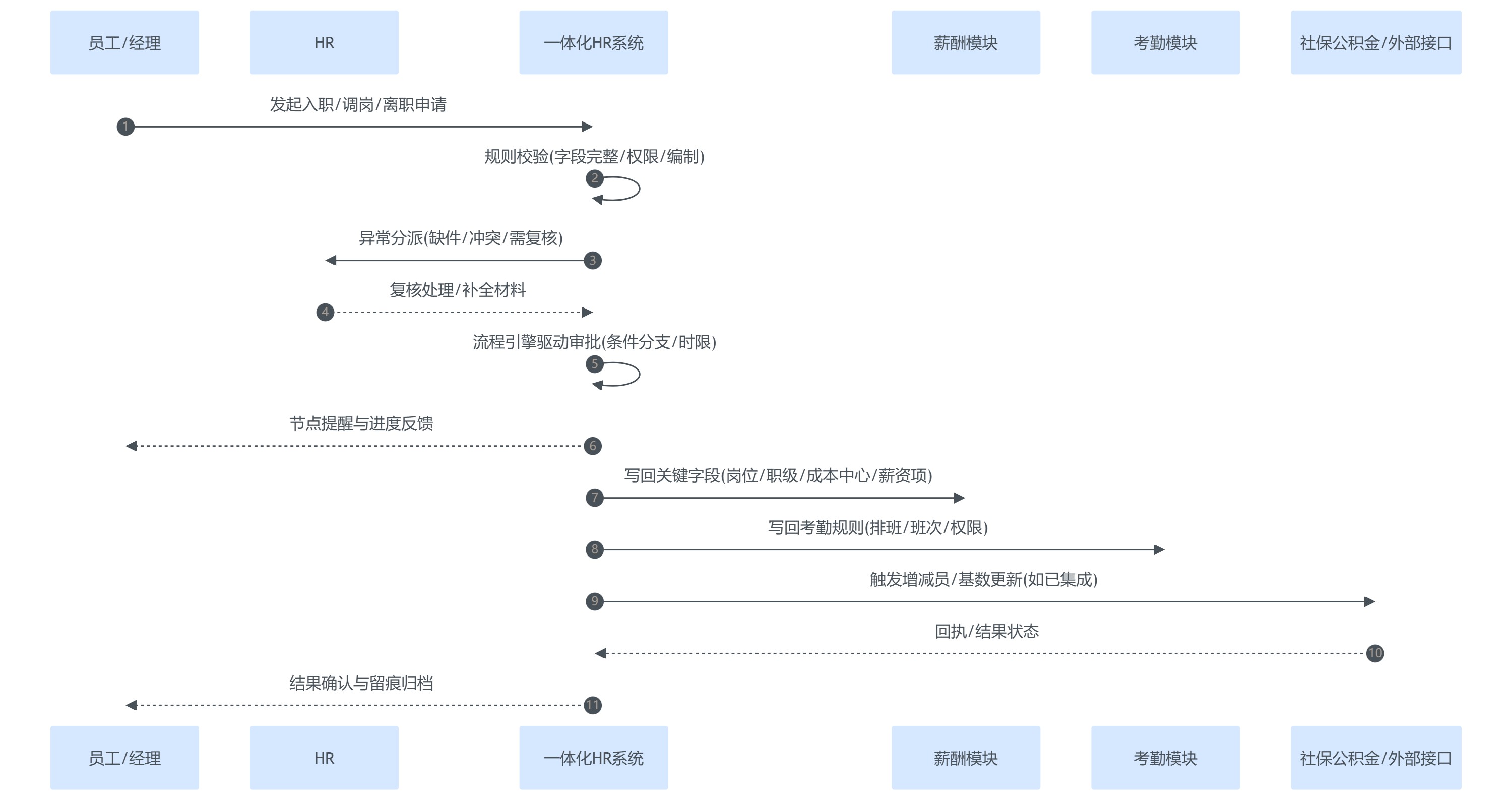 | 2 流程化管理 | 流程在OA,数据在HRIS | 流程完成即写回数据,留痕可追溯 | OA通过但主数据未变更 |