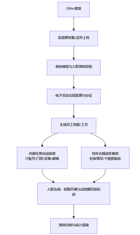 | 员工体验 | 首日填表、找人、等权限 | 到岗即用,任务自动派发 |