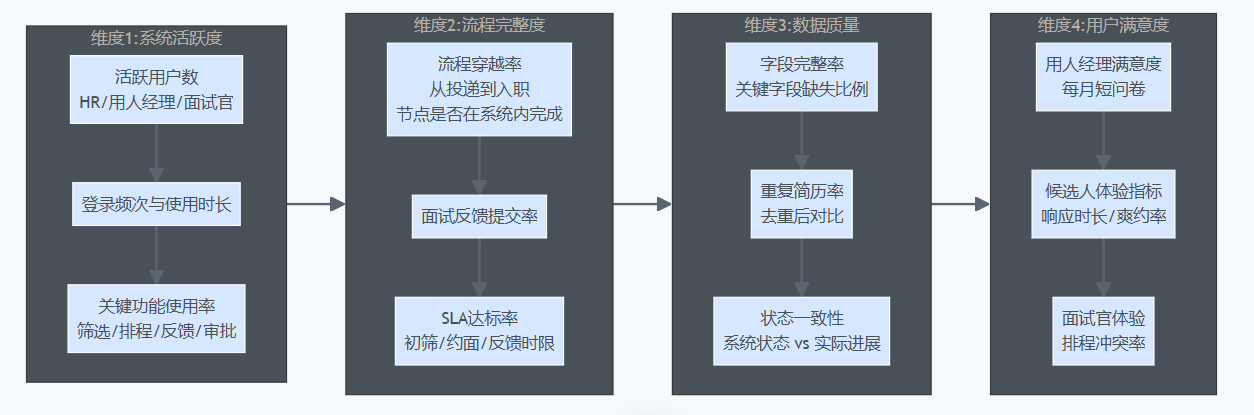 - 把流程穿越率作为组织指标:例如定义:从简历进入到面试反馈,80%以上节点必须在ATS内闭环;如果业务在系统外推进,相关数据视为无效。指标不一定要硬绑个人绩效,但要作为部门复盘的重要维度,否则影子流程无法治理。