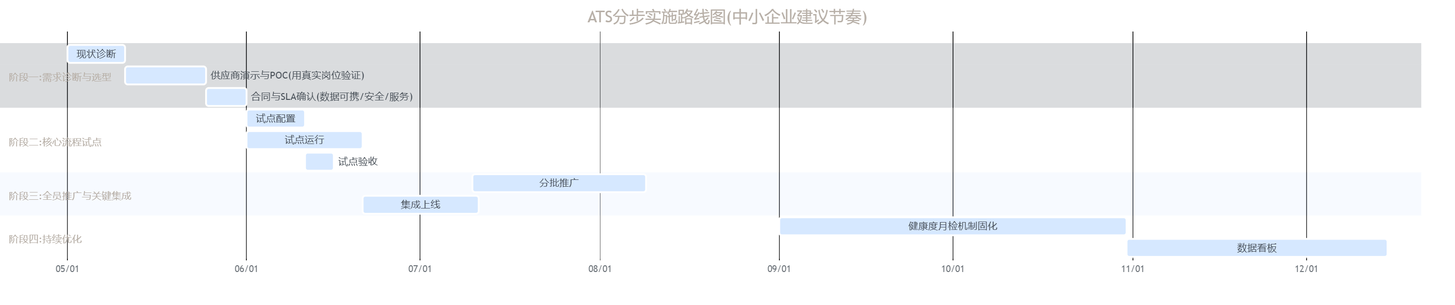中小企业资源有限,一次性全员铺开ATS,往往会带来业务震荡和抵触情绪。更可控的路径是先试点跑通价值,再按集成优先级逐步扩展,避免把新系统做成新的孤岛。