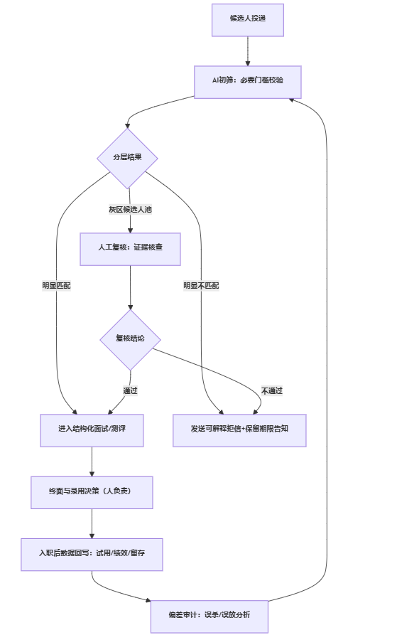 - 把AI定位为分流器,不是裁判:设置灰区候选人池、人工复核标准与改判原因记录,并保留可解释拒绝与必要的申诉入口。