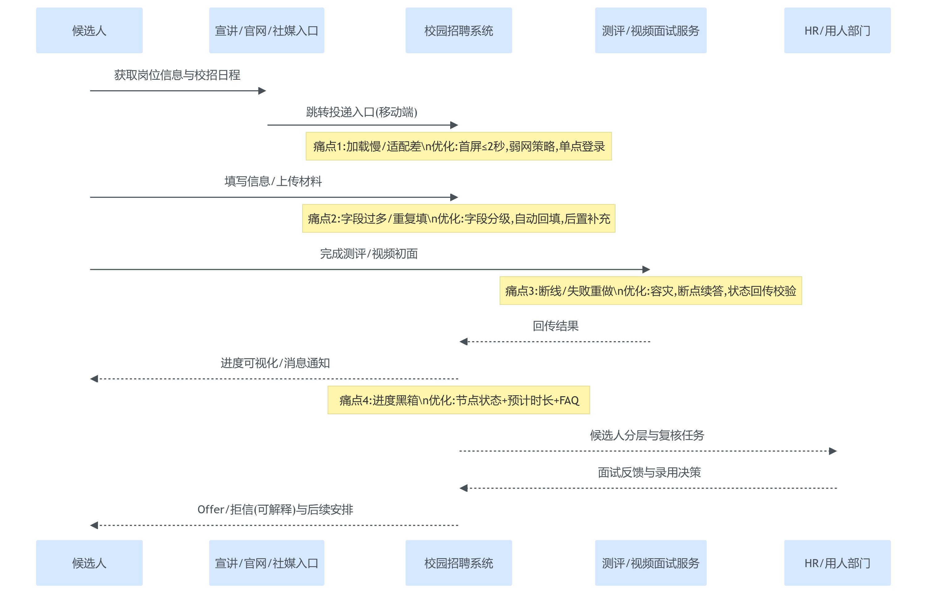 | 候选人角色 | 被动填表与等待 | 可视化进度、可选择路径(宣讲/内推/测评) |