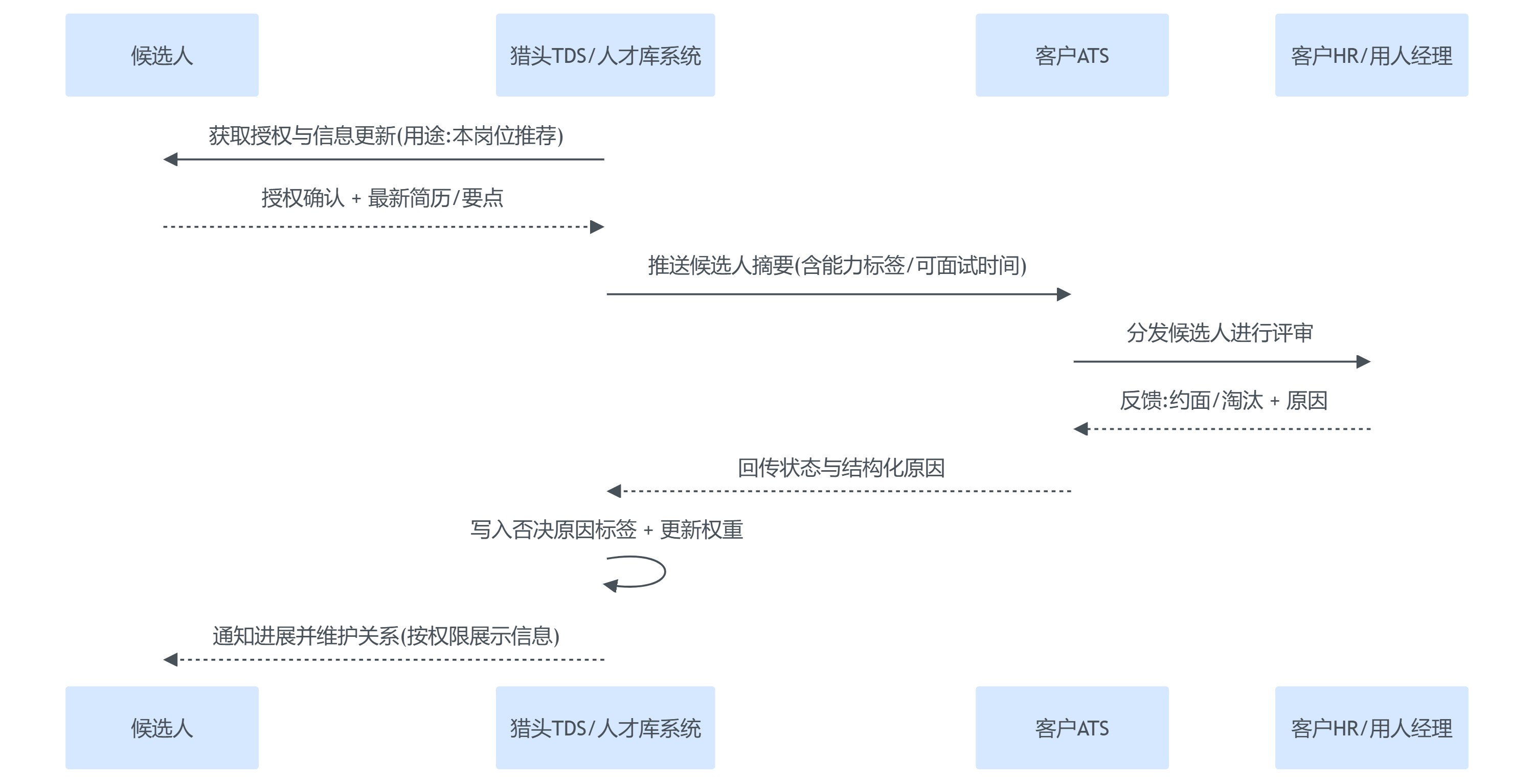 - 候选人推荐推送:猎头TDS向客户ATS推送候选人摘要(先不含敏感字段,或按授权规则推送)。